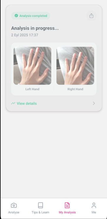 Upload photos of both hands and receive comprehensive analysis results in seconds.